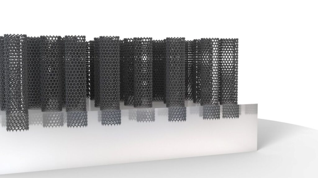 NAWAH possesses unique expertise in the industrial-scale production of vertically aligned carbon nanotubes (VACNT), precisely controlled at nanometric scale. We finely customize the length, density and microstructuration of the nanotubes, thus tailoring the material’s properties to meet specific client requirements.